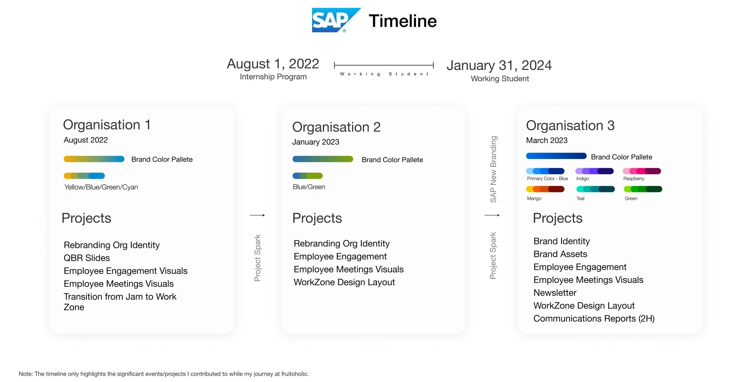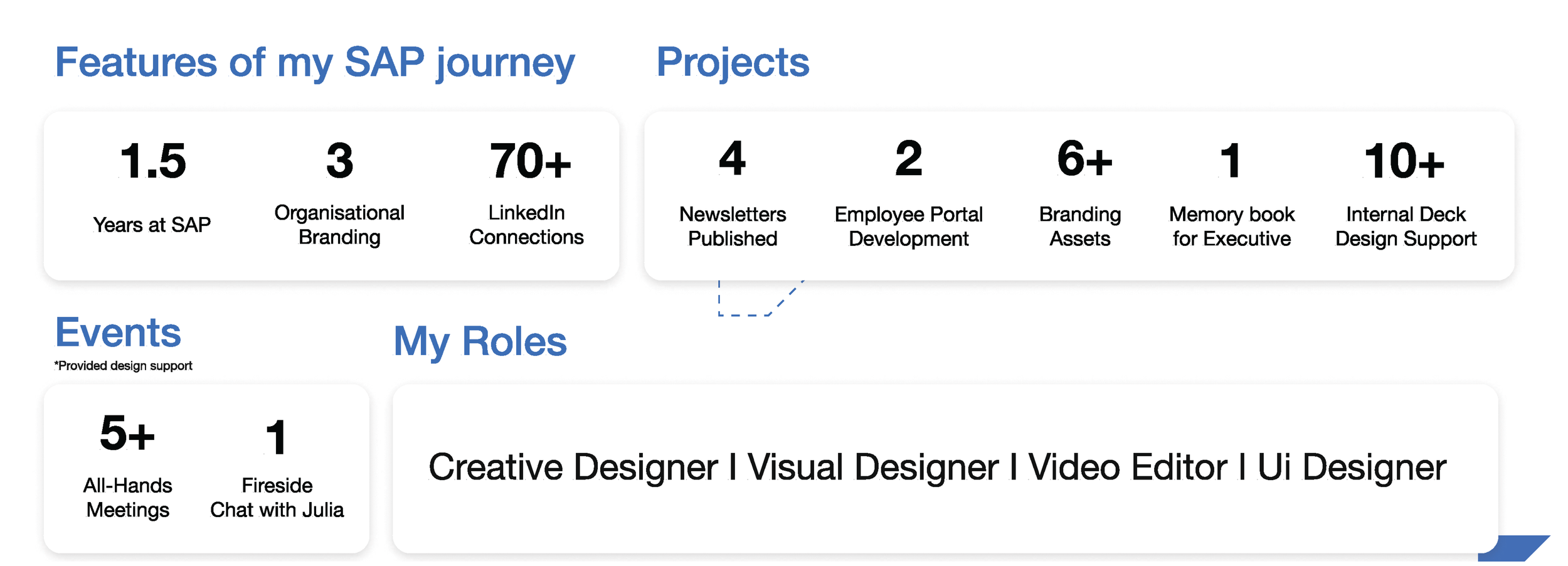 My journey at SAP was almost 2 years, as an intern, and I work as a visual designer, enhancing the user experience of SAP's internal employee portals. Developing branding assets for the team for internal use was my core role. I have been having an amazing experience working with such a wonderful team on great projects.
