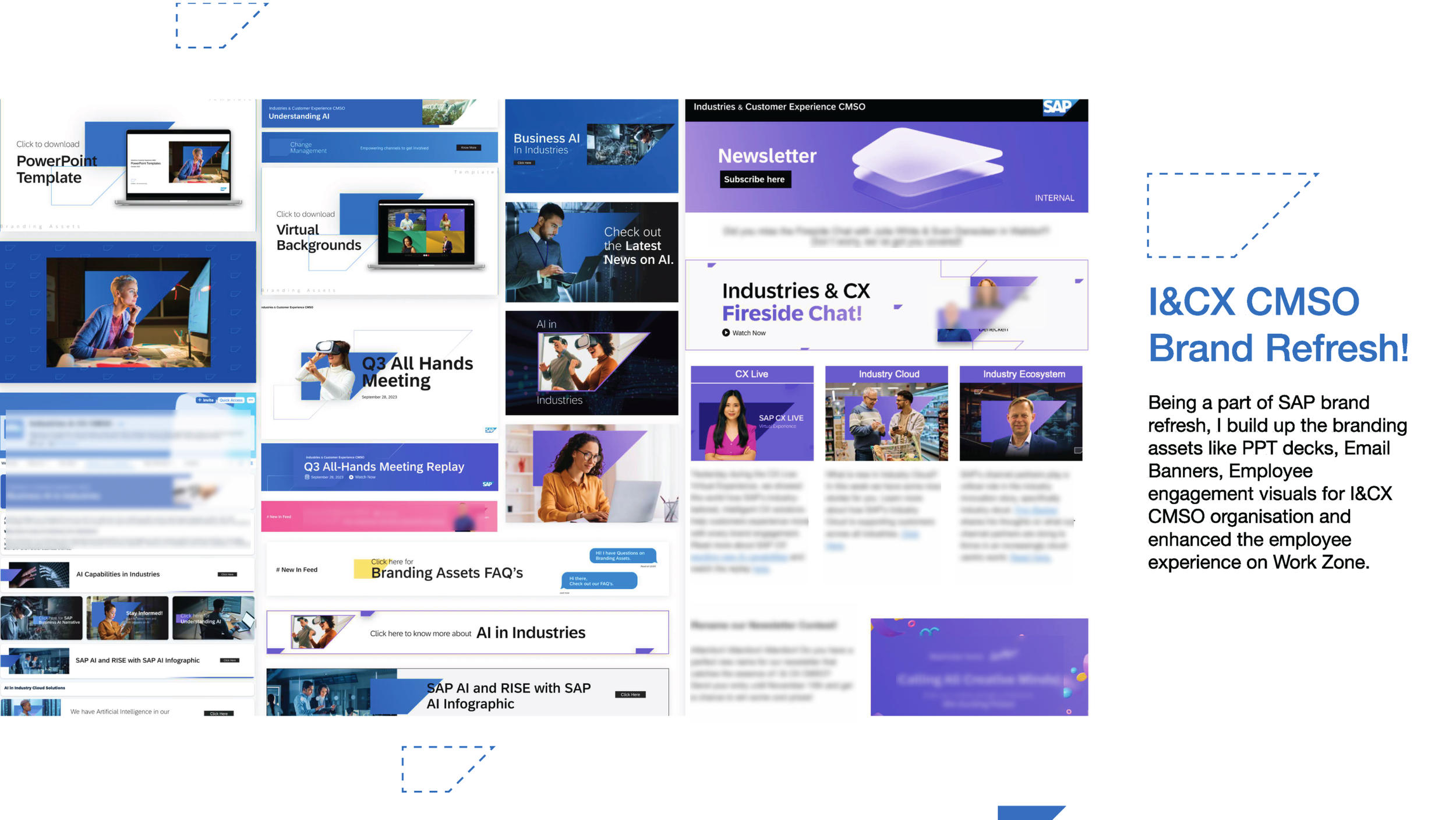 I worked on these internal portals to make the user's journey aesthetic and user-friendly. The brand assets of industries at SAP are equally important to upgrade for better performance and visibility of the brand within SAP. Designing brand assets incorporating the official brand standards of SAP has also been my cup of tea.